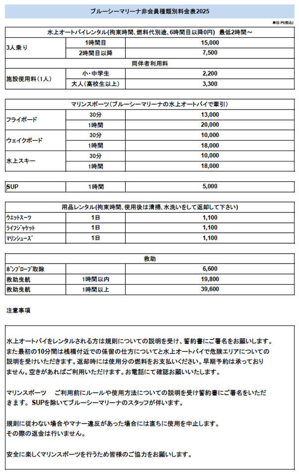 ブルーシーマリーナでは会員と非会員に水上オートバイのレンタルとマリンスポーツを行います。規約とローカルルールがございます。スタッフが説明いたしますがこれに必ず従ってください。